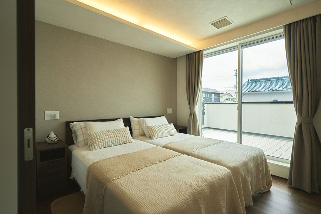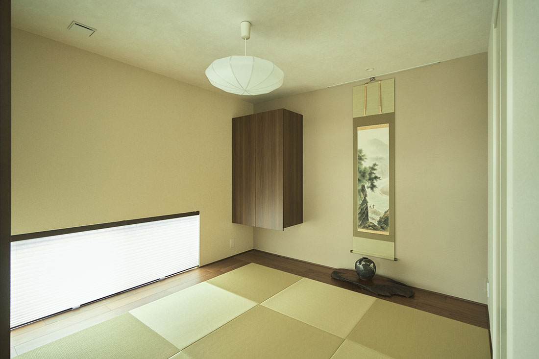 1階は、坪庭が見える地窓や障子扉、掛け軸を飾った和室など、和の趣が感じられる落ち着いた空間に。キッチンはリクシルの「リシェル」を採用し、落ち着いたダークトーンで統一しました。冷蔵庫上部の木製ルーバーや背面収納の豊富な収納力によって、生活感を抑えた洗練された空間が広がります。2階は奥様のルーツであるブラジルをテーマに、ビーチや森をモチーフにした遊び心あふれる小物で彩られ、全体がテーマに沿って美しくコーディネートされています。さらに、奥様が趣味で製作されている作品がリビング、寝室の随所に飾られ、世界に一つだけのインテリア空間を作り出しています。
