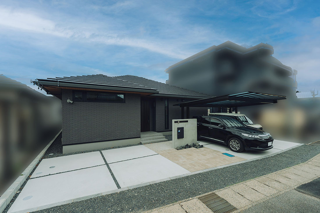 深いグレーの外壁に黒色のサッシを組み合わせた、シックで落ち着きのあるY様邸。平屋ならではの低く構えた屋根のラインや、木調の軒天と外壁のコントラストが美しく、堂々とした存在感を放っています。玄関まで続くアプローチはベージュ系のタイルで仕上げられ、モノトーンの外観に穏やかな印象を添えています。