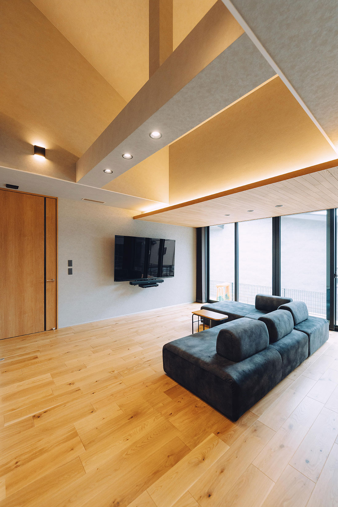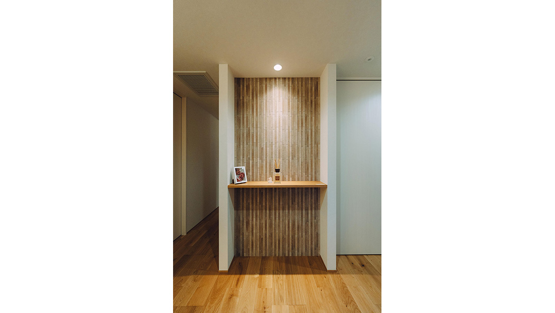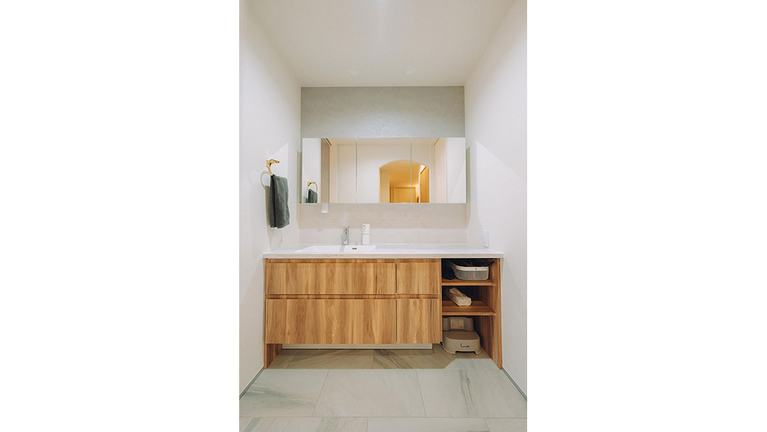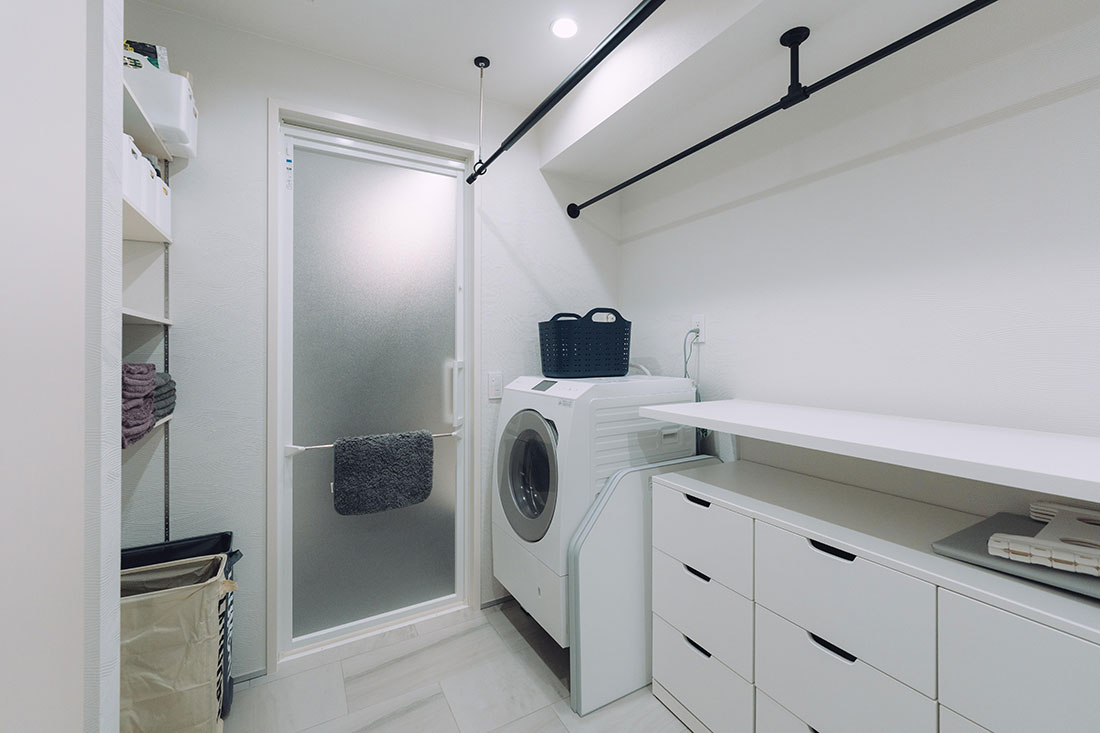 設計担当の三矢さんの提案で、下がり天井を長めに取り、間接照明と組み合わせることで、空間の広がりと木の温もりをより感じられるようになったと気に入っているそうです。「友人からもデザイン性だけでなく、女性目線で見ても間取りが良いと評判なんです」と奥さまも嬉しそうに語ります。Y様ご夫婦が最初にこだわったのは、まさに帰宅動線。玄関からまずリビングに入るのではなく、洗面所で手を洗い、ランドリーで洗濯物を出せるようにしたことで、日々の生活にゆとりが生まれました。さらに、ランドリールームに隣接したファミリークローゼットは収納力もたっぷり。アイロン台も置けるため、洗濯から乾燥、アイロンがけまで効率よく完結できるようになりました。