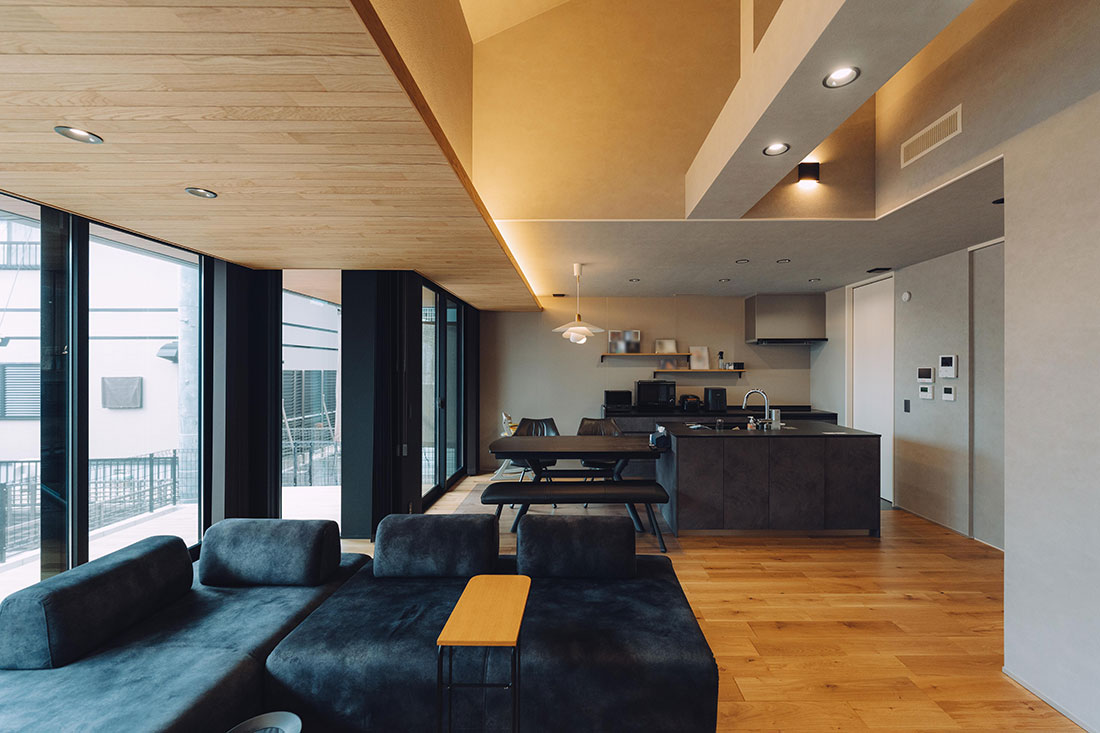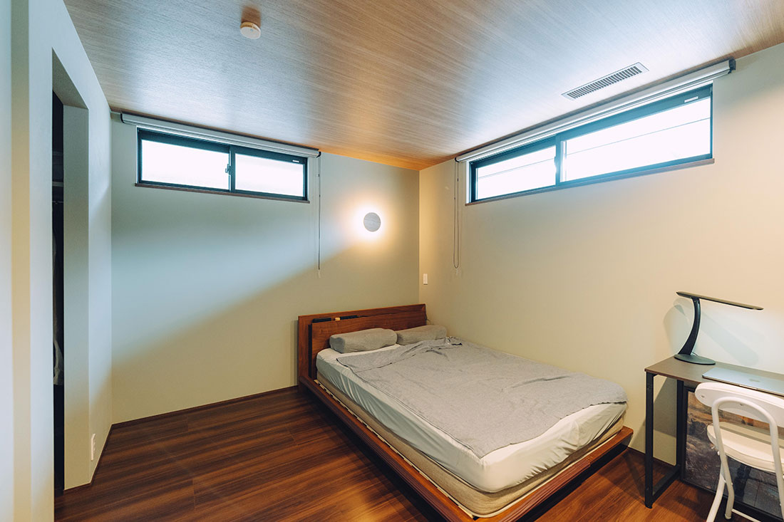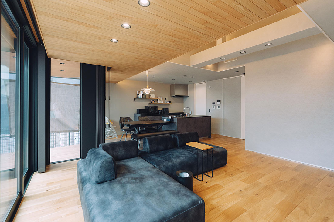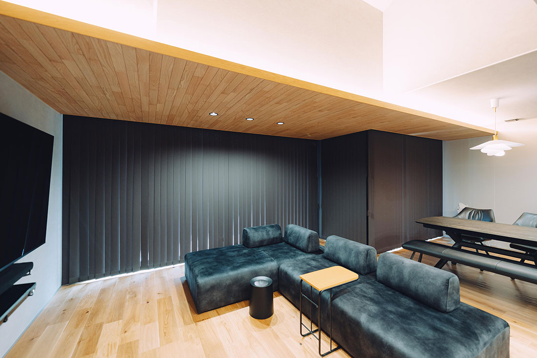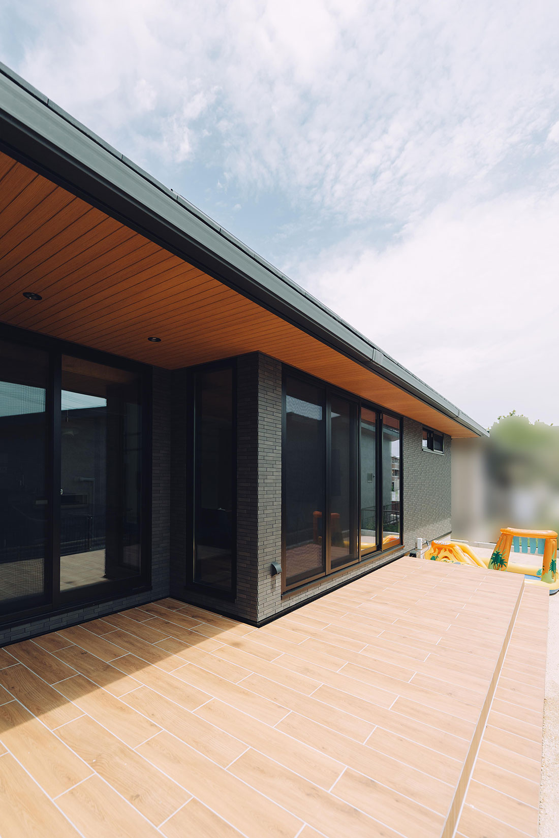木目調や黒、グレーを基調に“木の温もりを感じる空間にしたい”というご夫婦の希望は当初から明確でした。さらにご提案した間取りを気に入ってくださったことで、住まいづくりはスムーズに進んでいきました。特にこだわったのは、窓側の壁やブラインドをサッシと同じ黒で揃え、壁の一部もカラーリングを合わせることで南側全面が一体に見えるように工夫した点です。また、お子様と一緒に遊べるよう、リビングと統一感を持たせた木目調タイルのウッドデッキを設け、内と外のつながりを意識しました。さらに、ご主人が憧れていた吹き抜けを実現するため、平屋でありながら天井高を確保。グレーの壁紙を合わせることで、柔らかく開放感あふれる空間に仕上がりました。