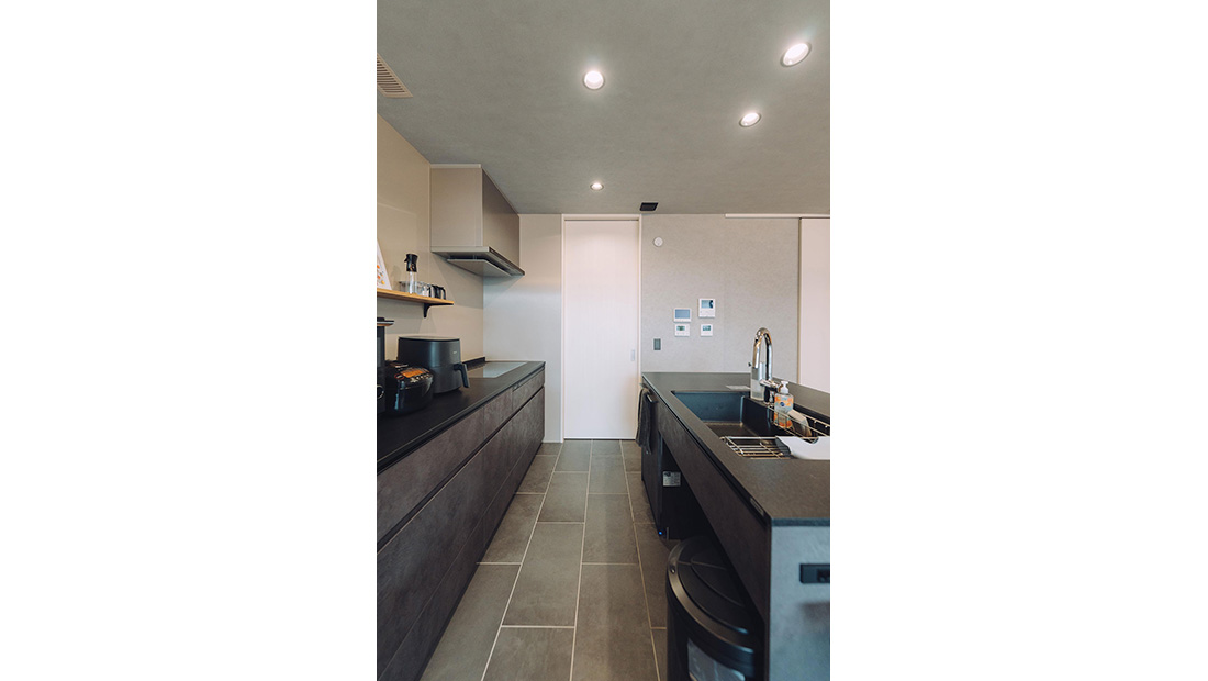 家族3人が並んでも余裕のある広々とした玄関の正面には、旦那様お気に入りのエコカラットのタイルを敷き詰め、和の落ち着いた雰囲気を演出しています。全体を黒でまとめたキッチンには奥様のこだわりでⅡ型を採用。油跳ねをそこまで気にせず使えるようになり、床材はタイルにしたことで掃除も簡単です。さらに、パントリーを設けたことで、収納力も格段にアップしました。「子どもが『家好き』って言ってくれるんで嬉しいですね」と、リビングを走り回るお子様を優しく見つめるY様ご夫婦。家族全員が笑顔で過ごせる、大好きな住まいが完成しました。