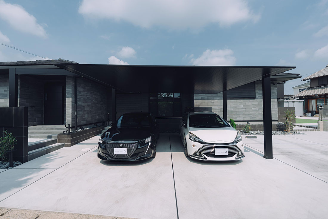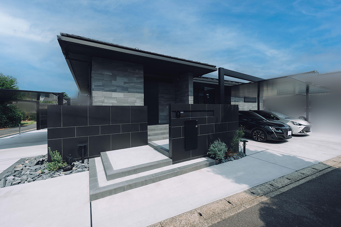 タイル調の外壁と濃淡の異なるグレーを組み合わせた、重厚感あふれる佇まいのT様邸。外構には石や植栽があしらわれ、素材感も愉しめる仕上がりに。さらに、黒色の門塀やカーポートが全体を引き締め、シャープで上品な表情を生み出しています。横方向に広がるデザインにより、堂々とした存在感も際立っています。