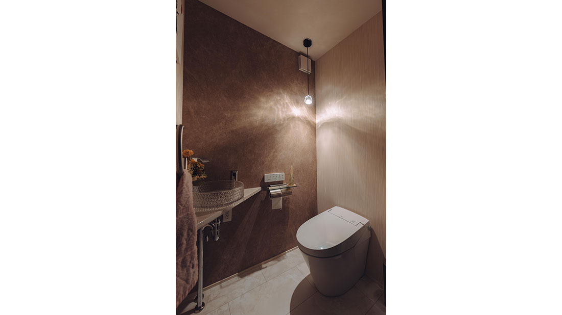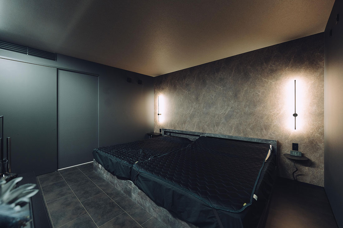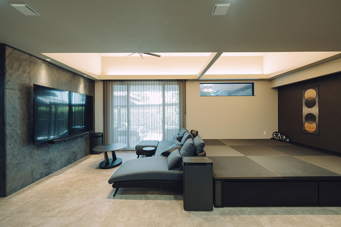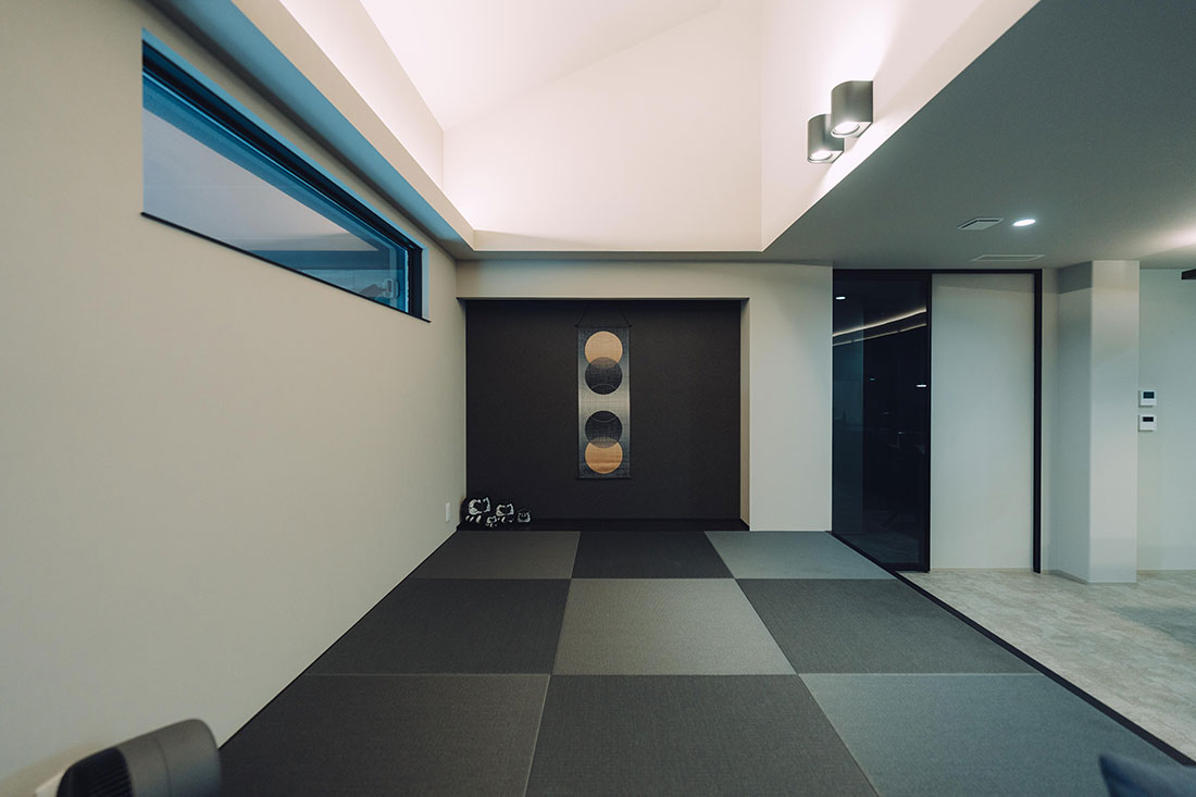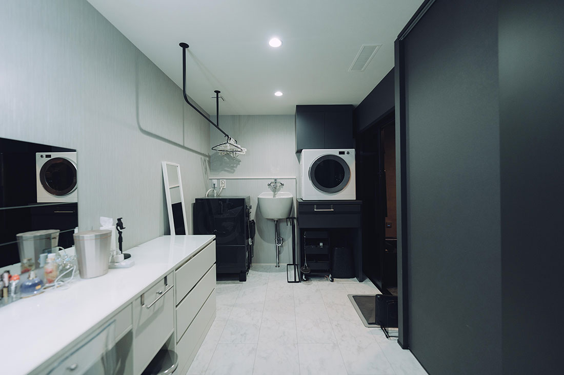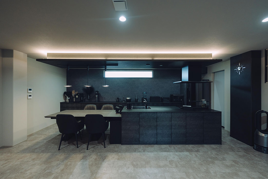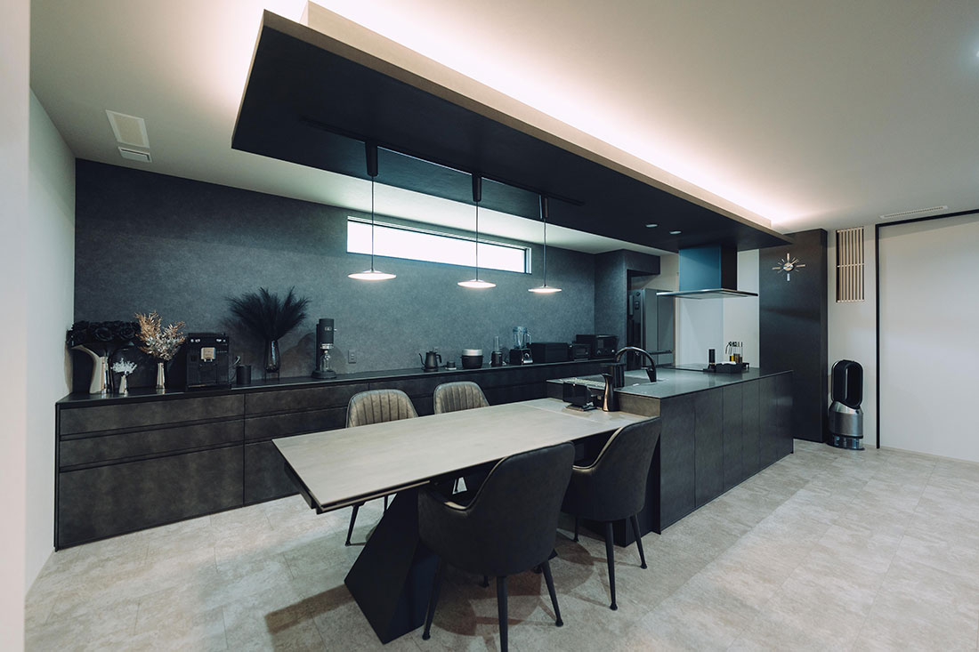 木目を極力排除し、黒を基調としたホテルライクな雰囲気を追求したT様ご夫婦。旦那様のセンスが光る統一感のある家具を取り入れることで、空間全体に洗練された印象と格調の高さを演出。また、畳の小上がりスペースを設け、選び抜かれた掛け軸や旦那様の趣味で集めた小物を随所に配置することで、ホテルライクに寄り添いながらも個性が際立つ、唯一無二の空間に仕上げました。さらに、工夫された家事導線により日々の家事が格段に楽になり、時間だけでなく心にも余裕が生まれるように。衣類をまとめて収納できるファミリークローゼットも、暮らしの大きな支えとなっています。デザイン性と機能性が見事に両立した、理想の住まいが実現しました。