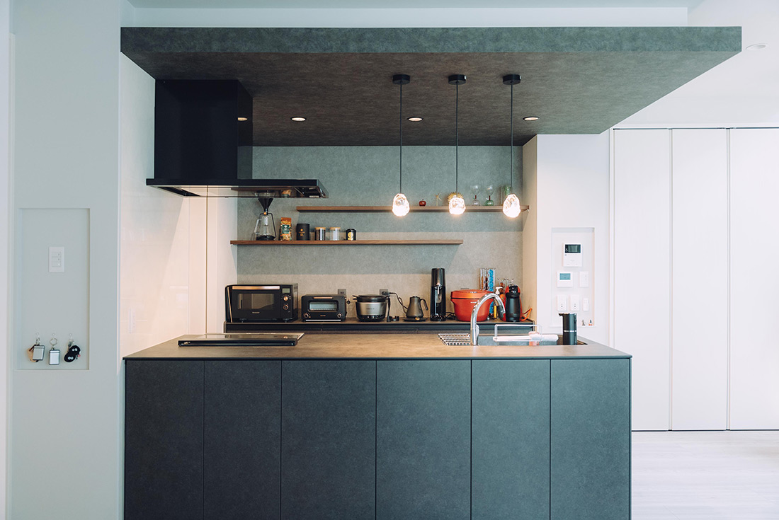 在宅ワークが多い旦那様のために設けた書斎は、好きなものを集められる十分な広さを確保し、落ち着いた色合いの壁紙を採用。以前はリビングで仕事をしていましたが、今では仕事が捗るお気に入りの空間になりました。また、キッチンの飾り棚には旦那様の趣味であるコーヒーをディスプレイし、お二人でゆったりとコーヒータイムを楽しんでいるそうです。最後まで悩んだ末、旦那様の「毎日使うものだから」という決断で選んだ特注のフロントオープン食洗機は大活躍。毎日の暮らしの質が格段に向上し、奥様も大変喜ばれていました。「今の暮らしが満足すぎて、居間にいるだけで幸せです」と語るお二人ですが、猫が大好きなお二人は、いつかは吹抜けにキャットウォークを設置して猫と一緒にのびのび過ごすことも楽しみにしているそうです。
