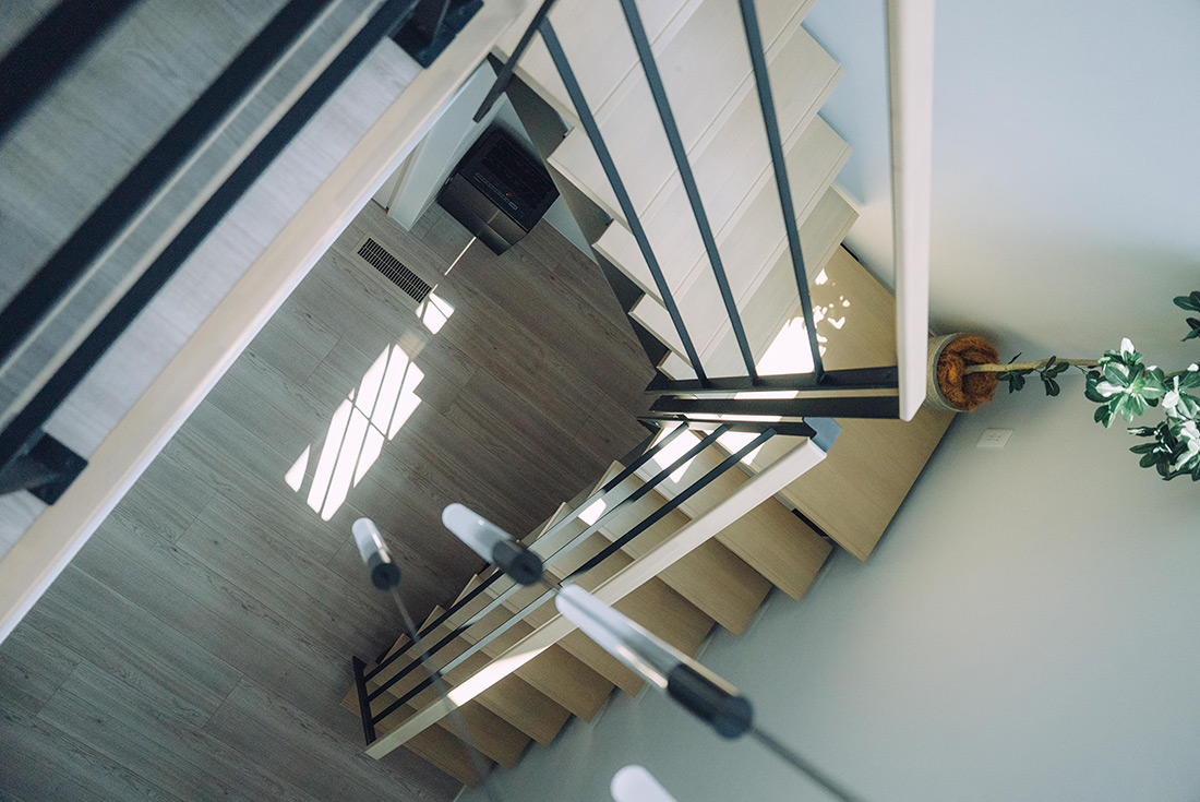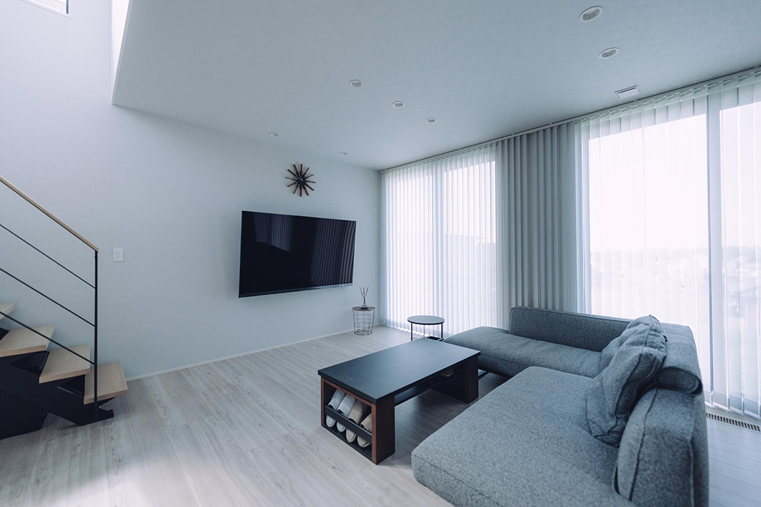 LDKや主寝室からの眺望が素晴らしい敷地でしたので、その風景を一枚の絵のように取り入れる「借景」を意識した設計といたしました。朝日はスケルトン階段の窓から吹き抜けを通してLDKへ導き、日中も常に太陽の光が差し込むよう配慮しています。