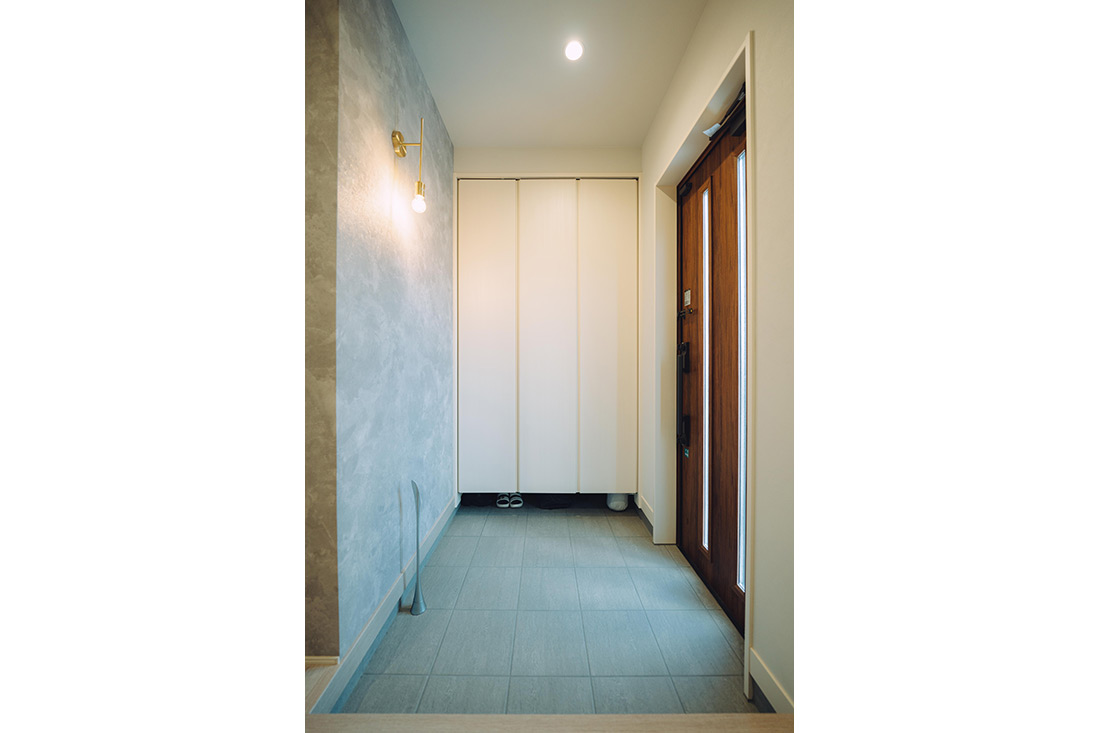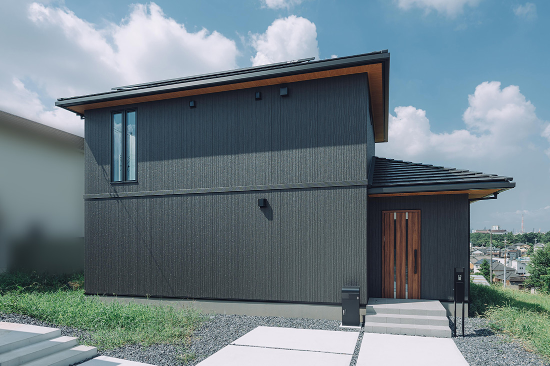 ブラックの外壁に、木目の軒天と玄関扉をアクセントに取り入れ、落ち着きと温もりを感じさせるI様邸。アプローチには明るい色調のコンクリートと砂利を組み合わせ、モノトーンの外観に軽やかさを添えています。訪れる人をやさしく迎え入れつつ、凛とした佇まいを見せるお家となりました。