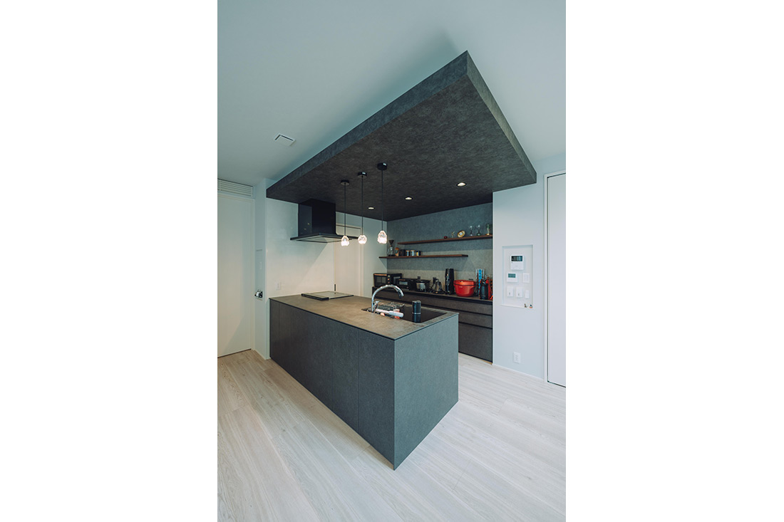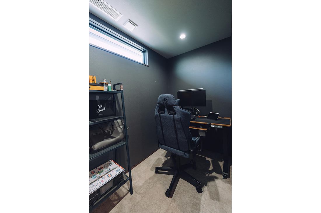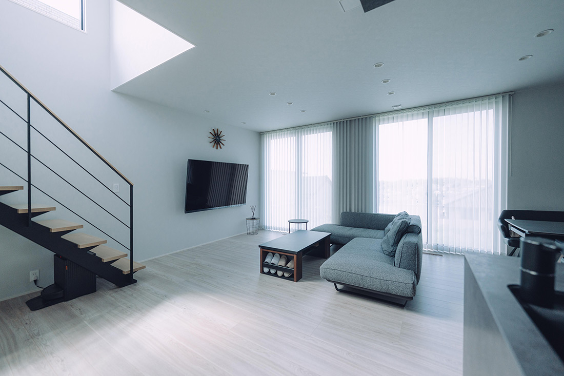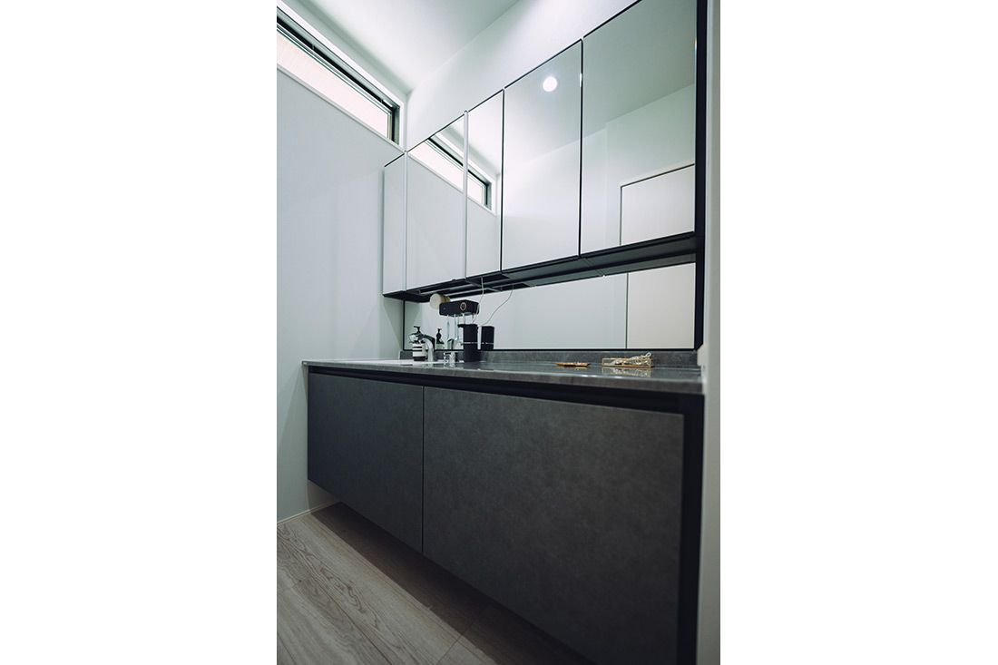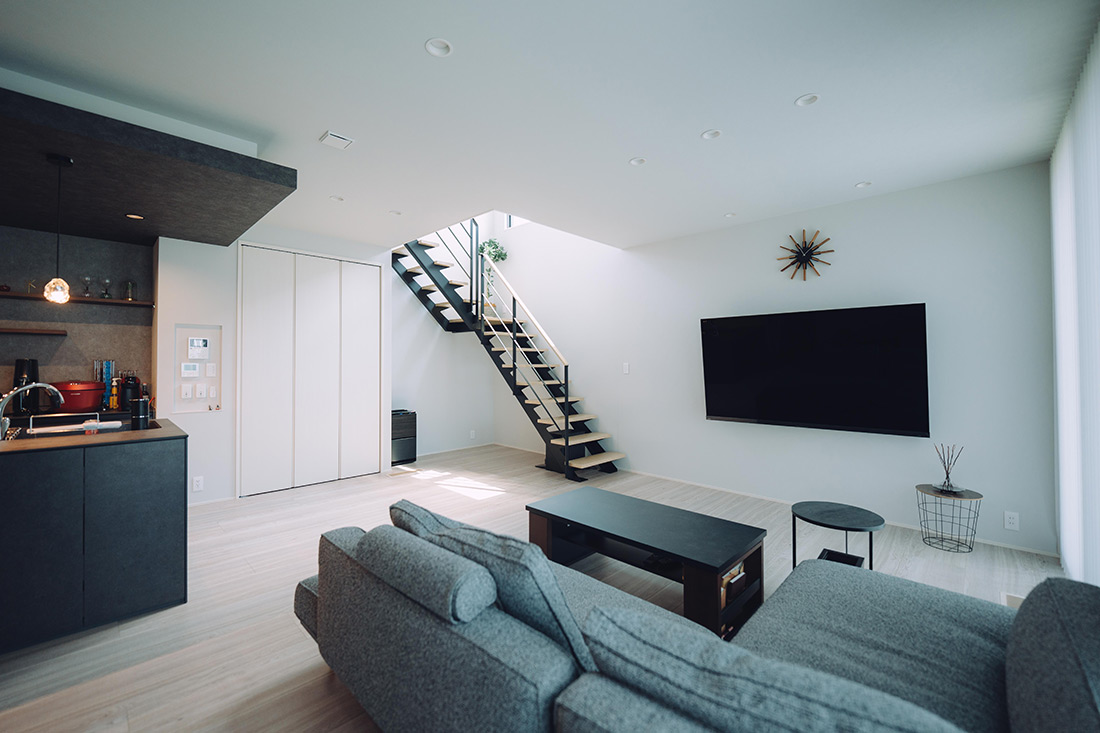 SNSで間取りに関する情報を集め、気になったクロスは品番までメモをして、取り入れたいアイデアを営業に相談しながら理想の住まいをつくり上げていきました。「吹抜けとブラックやグレーの色味は譲れませんでした」と旦那様。外観もブラックを基調とし、大きな窓から差し込む光が吹抜けと相まって、いつも明るいリビングを演出しています。また、洋服が好きな奥様の希望に合わせ、1階と2階にウォークインクローゼットを配置。1階には仕事で使うスーツなど日常的な衣類を、2階には可動棚を使いつつ、セレクトショップのようにテンションの上がるお気に入りの服を収納し、用途に応じて使い分けられるようになりました。