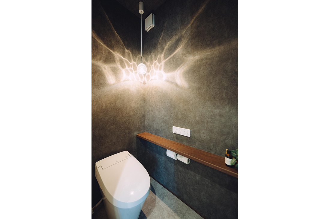 「寝室の横長で大きな窓から見る満月が、 一枚絵のように見えるんです」と語るお二人。今でも朝起きると思わず外を見てしまうほど、その眺めの美しさがお気に入りだそうです。家づくりでは、旦那様が設備の機能性を、奥様が色味やデザインを担当し、それぞれの得意分野を活かして進めたことが、特に印象的だったと振り返ります。奥様が選んだウォークインクローゼットのバブルシャンデリアは、光がシャボン玉のように揺らめき、幻想的な雰囲気に。キッチンの照明のオーデリックロックアイスは、氷が浮かんでいるようなデザインに一目惚れし、3つ並べることで、空間に遊び心とリズムを生み出しました。