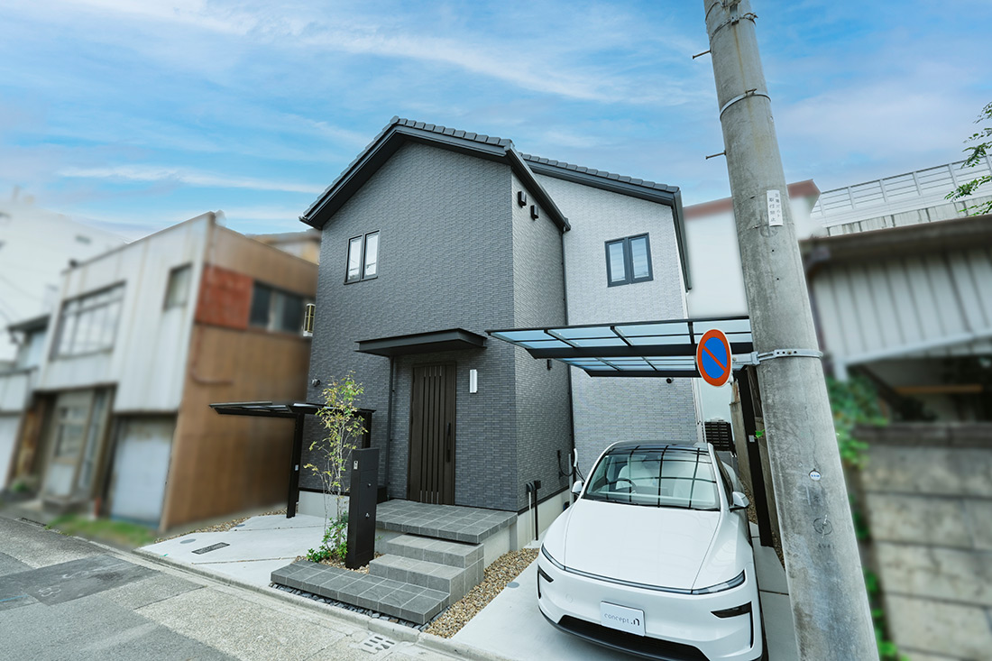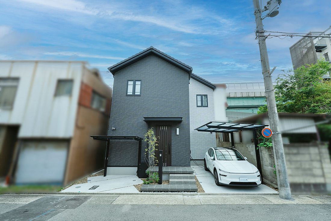 濃いグレーと淡いグレーのツートンの外壁が印象的なI様邸。シックで上品な佇まいが、落ち着いた雰囲気を漂わせます。玄関ポーチ横に配置された駐輪場やカーポートは、外壁のトーンに馴染むシックなデザインで、機能性と美しさを両立させました。シンボルツリーがさりげなく彩りを添え、洗練された中にも温かみが感じられる住まいになりました。