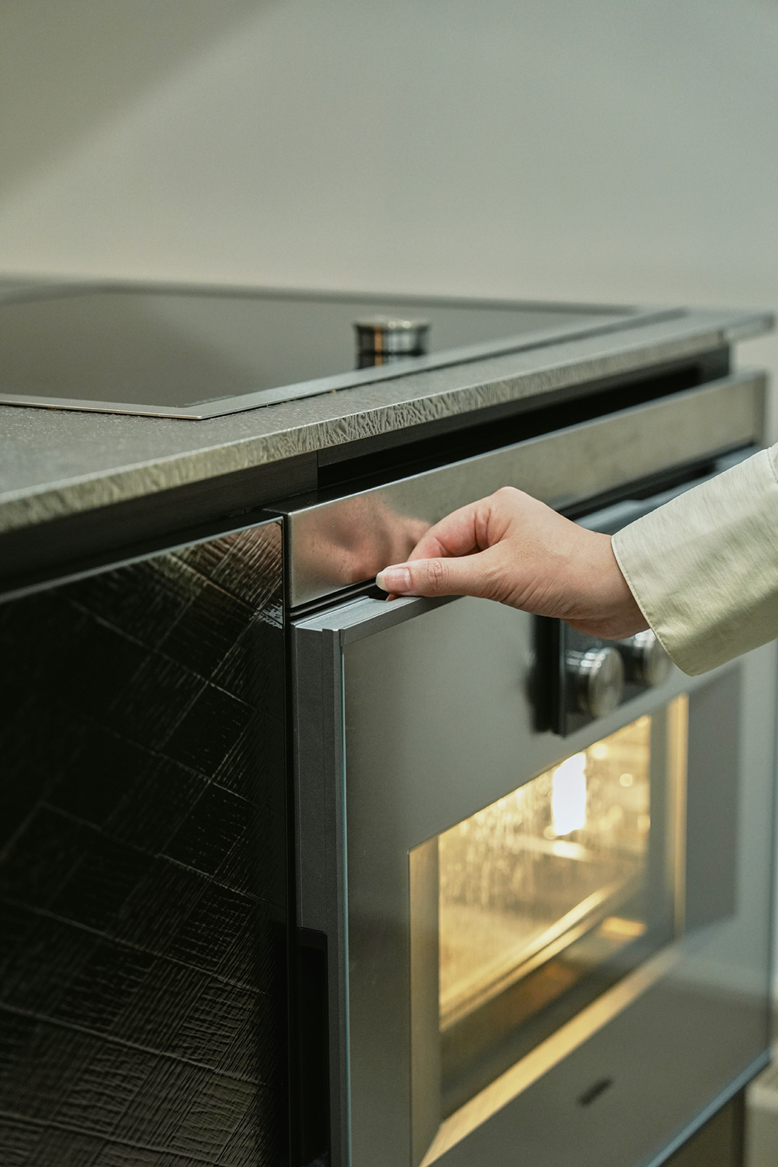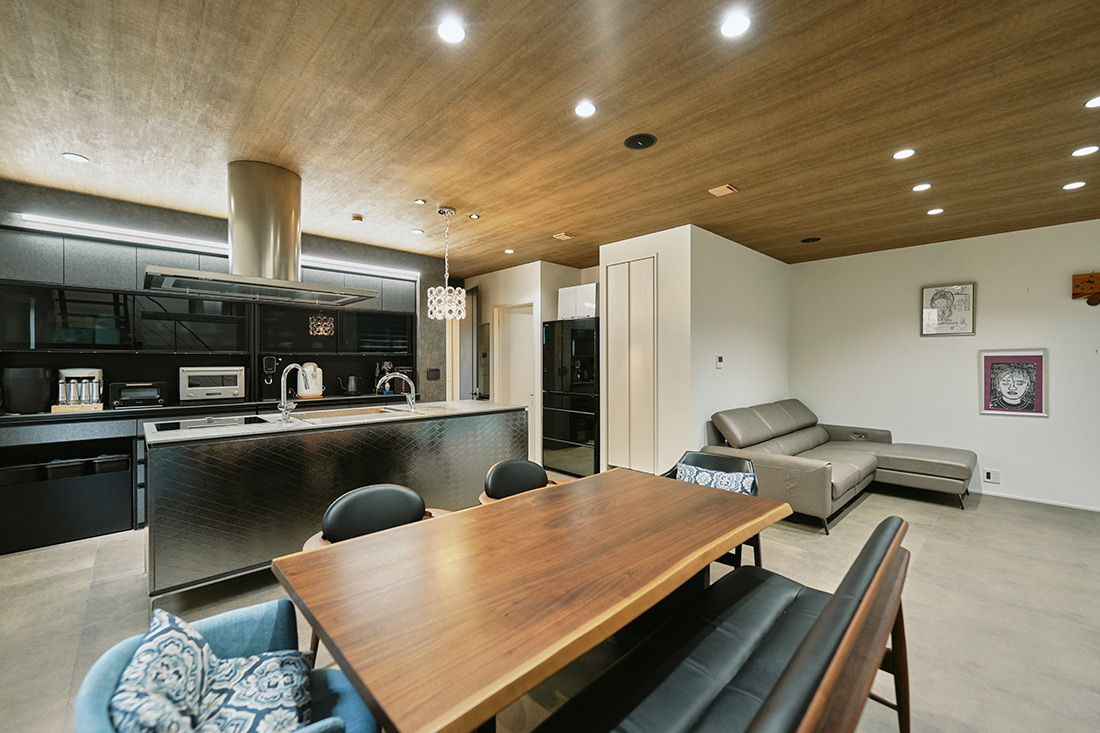 I様はトーヨーキッチンiNOからLDKのイメージが始まっていると言ってよい位、キッチンへの拘りを強くお持ちでした。完成した魅せるキッチン空間はとても印象に残っております。壁と一体化させた背面収納部にご用意させていただいたライン照明が効果的にキッチンを浮かび上がらせてくれて、そこにトーヨーキッチンのクランカー照明が入る事でよりキッチンをシンボル的に見せてくれました。家具についても沢山ご採用下さりありがとうございました。中でもダイニングセットは無垢板テーブルをご選びいただき、シックな空間に木材が入る事で、温かみも加わってお子様にも過ごして頂きやすい場所となったのではないかと思います。お住まいでの日々をご家族皆様楽しくお過ごしいただけましたら幸いです。ご担当させていただきありがとうございました。