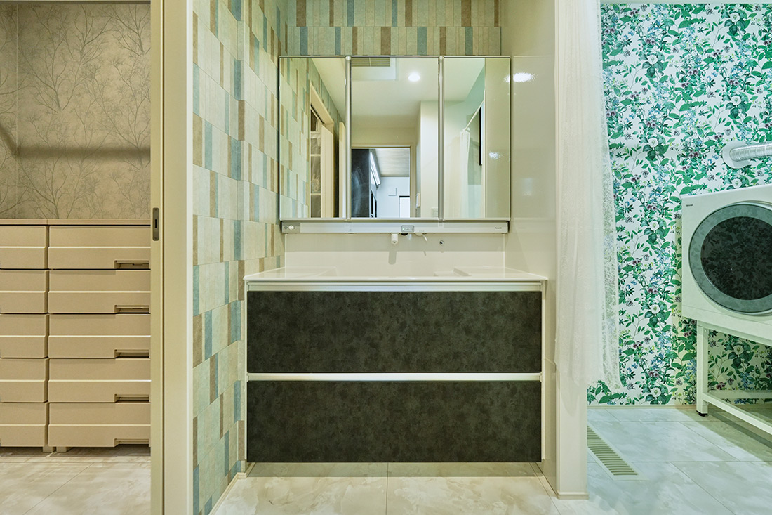 「打ち合わせはいつも和やかで、その後に近くでランチするのが夫婦の楽しみでした」と笑みを浮かべるI様ご夫婦。住まいの場所も、お子さまの校区が変わらないように配慮して決定し、家族みんなが安心して暮らせる環境にこだわりました。吹抜けやアイアンのスケルトン階段で開放感あふれるLDKは、キッチンからリビング全体を見渡せる設計で、子どもたちの遊ぶ姿や、ソファで丸くなる猫の様子を眺める時間が、至福のひとときだそうです。さらに、お風呂やランドリールームなどの水まわりを1階にまとめて、1階だけで家事が完結できるよう工夫しました。そのおかげで、洗濯のたびに2階へ上がる必要がなくなり、「家事がすごく楽になった」と奥様も大喜びでした。
