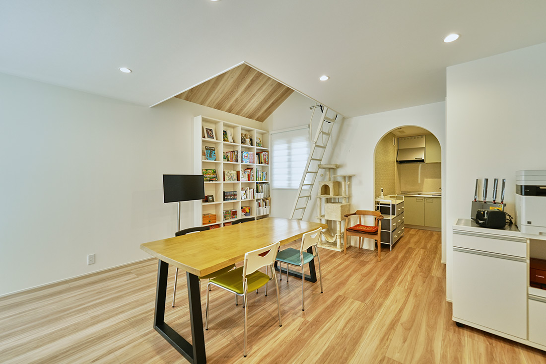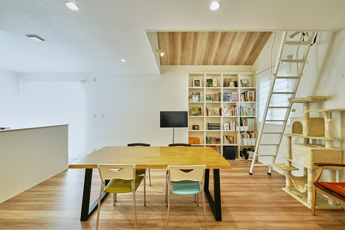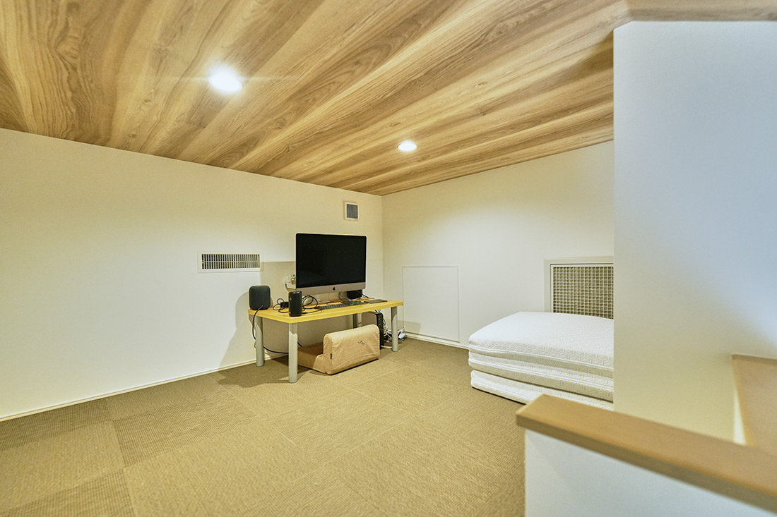 ロフトはお子様だけでなく、旦那様の隠れ家としても活用され、プロジェクターを設置して映画を楽しむこともあるそうです。 ロフト下のセカンドリビングは、勉強はもちろん、卓球など遊び場としても使われています。お子様が個室にこもるのではなく、フリースペースとして家族の気配を感じながら過ごせるよう配慮されました。また、ここでは週に一度、家族会議が開かれ、1週間の出来事を振り返ったり、次の予定を話し合ったりと、温かい時間が家全体に自然に広がっています。壁に飾ったお子様の作品は友人にも好評で、これからさらに増やしていく予定だそうです。「年数を重ねるごとに、もっと私たちらしい家をつくり上げていきたいですね」と、嬉しそうに語る奥様でした。