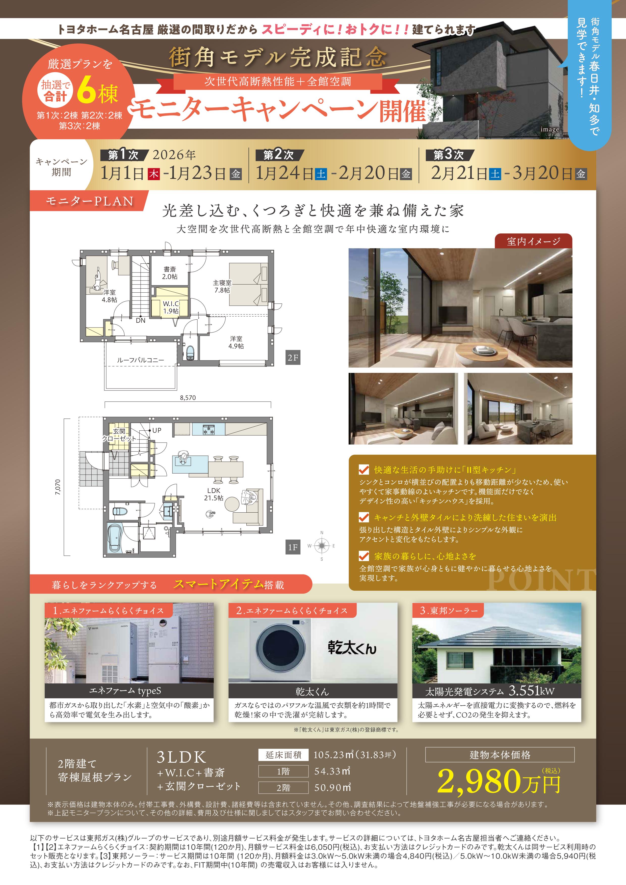 ≪モニターキャンペーン≫トヨタホーム名古屋 厳選の間取りだから \\ スピーディに!おトクに!//厳選プランを抽選で合計6棟お得にご提供!!■建物本体価格:2,980万円