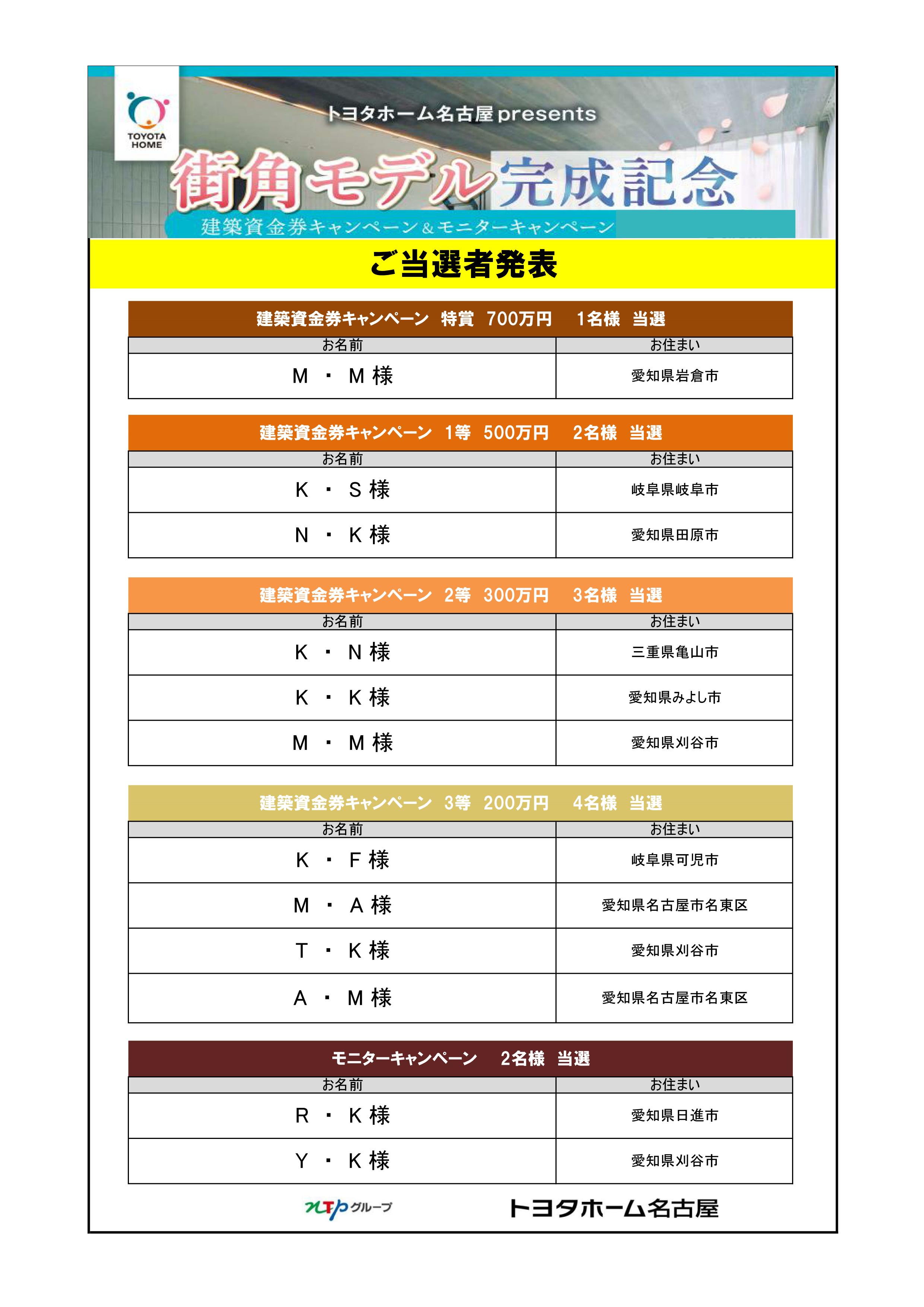 街角モデル完成記念 建築資金券&モニターキャンペーン(3次) 当選発表!